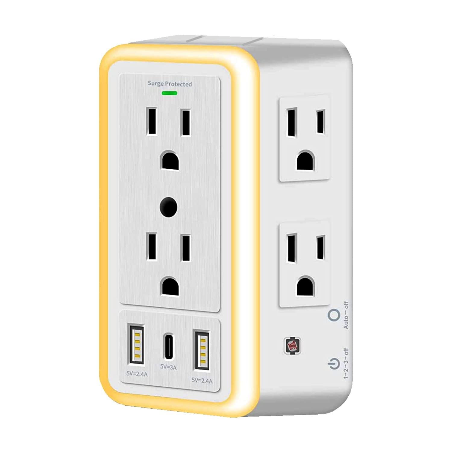 6 AC outlets with 2.1 inches long space in between,2USB A & 1USB C Smart Charging Ports(Total 3.4A)Smart night light with touch sensor, three levels ofadjustable brightness let you choose the right amount oflight for your own needs.